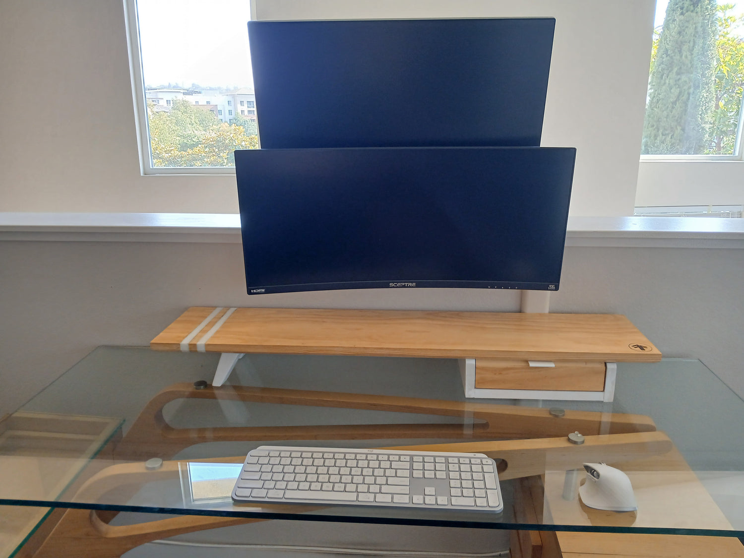First & Fern's Computer Monitor Stand Desk Setups pair hand-stained wood, with white inlays, providing a unique and clean two-tone color schemed design. Perfect for adding an optimal sightline to your monitor, so you can comfortably focus on the task at hand.