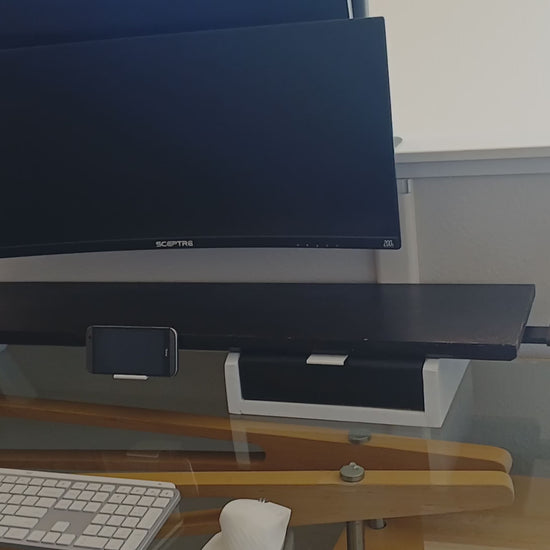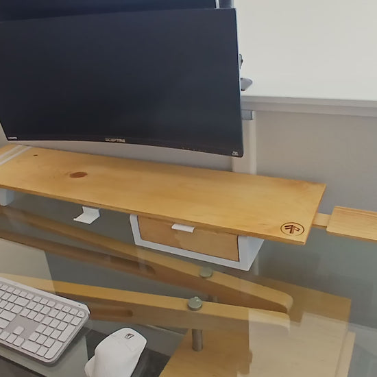 This premium Computer Monitor Stand Setup pairs either Birch or Dark Walnut stained wood, with white metal inlays, providing a unique and clean two-tone color scheme that enhances any desk. The addition of the drawer from the base model adds functional storage to keep your workstation or creative space uncluttered and organized. This piece has been handcrafted with precision and designed to provide an optimal sightline so you can comfortably focus on the task at hand.